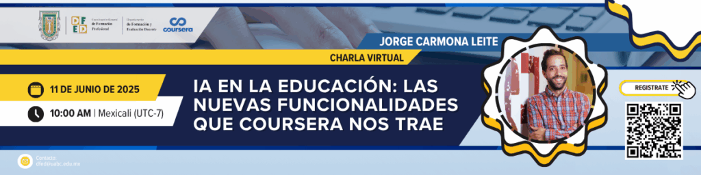 Estan cordialmente invitados a nuestra siguiente CHARLA VIRTUAL: IA EN LA EDUCACIÓN: LAS NUEVAS FUNCIONALIDADES QUE COURSERA NOS TRAE