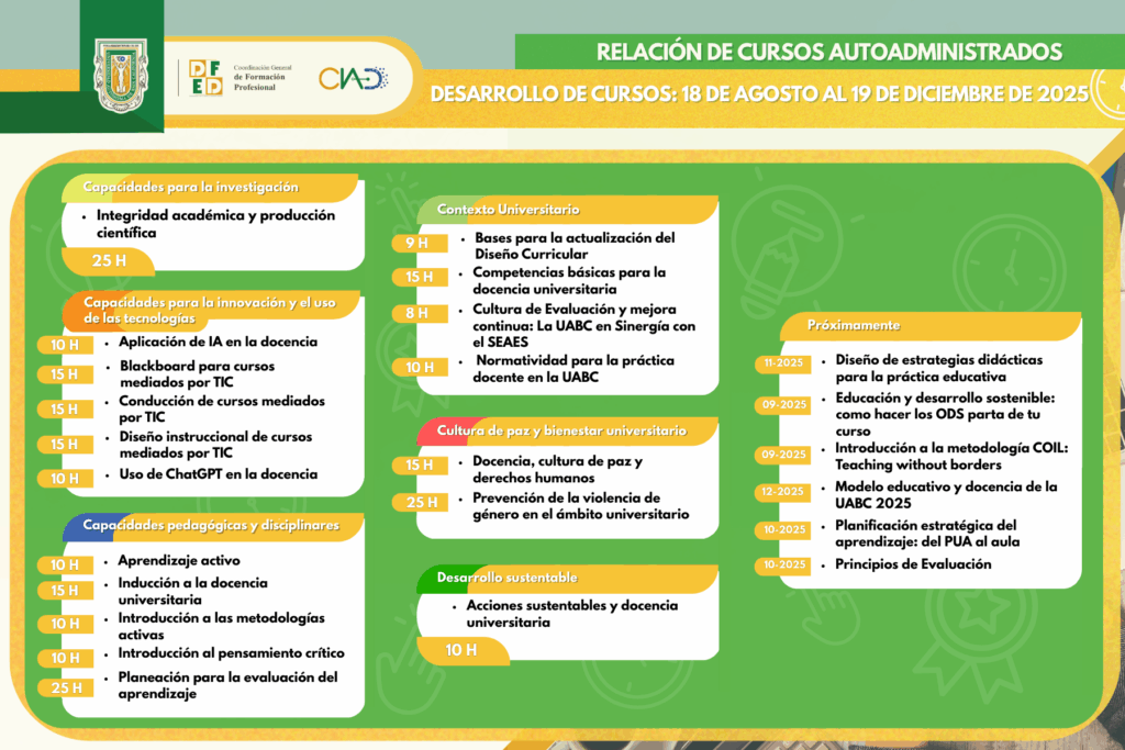 La oferta de cursos autoadministrados correspondientes al semestre 2025-2, desarrollados como parte del Programa de Formación y Desarrollo Docente de la UABC